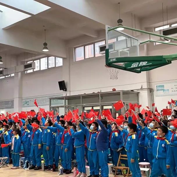 随后,现场500余名师生肃然起立、高举国旗,同唱《歌唱祖国》。鲜艳的五星红旗汇聚成红色海洋,飘荡在体育馆上空的嘹亮歌声,充分体现了大、小学生对于祖国的热爱之情。
