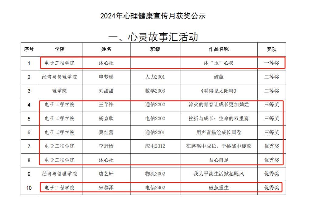近日,学校公布了2024年心理健康宣传月活动的获奖名单,在“关注心灵·同行你我”心灵故事汇活动中,我院喜获佳绩,共获一等奖一项,三等奖三项,优秀奖三项。 其中,沐心协会的《沐“玉”心灵》荣获一等奖;通信2202王芊祎的《淬火的青春让成长更加灿烂》、电信2202杨京欣的《挫折与成长:生命的双重奏》与通信2201冀红蕾的《用声音描绘成长画卷》荣获三等奖;应电2312李舒怡的《在磨砺中成长,于挑战中绽放》、沐心协会的《吾心自足》与电信2402宋慕泽的《破茧重生》荣获优秀奖。