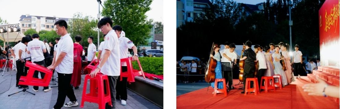 活动前期,志愿者团队在工作人员统筹下,全力投入惠民市集与舞台的布置工作,为活动开展做好基础保障。部分志愿者协助演员排练走位,确保演出各环节衔接流畅。演出期间,团队分工协作,高效完成各项服务。大家围绕舞台需求,在双林街道相关负责老师的指导下,承担道具摆放与撤离的重点任务,包括凳子、架谱、立麦等物品的及时调度,还随时待命配合古筝等特殊乐器的搬运等等,保障节目顺利衔接。活动尾声《歌唱祖国》大合唱中,十名志愿者作为旗手团按指令站位,以饱满姿态和挺拔身姿融入晚会表演环节,将整场晚会推向高潮。