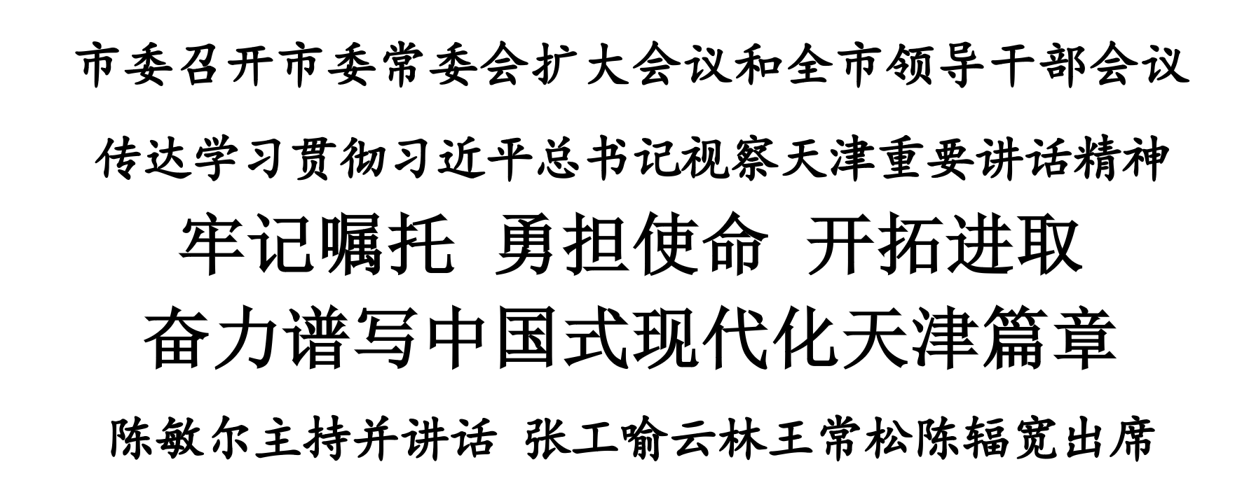 本报讯(记者于春沣刘国栋)2月3日,市委召开市委常委会扩大会议和全市领导干部会议,传达学习贯彻习近平总书记视察天津并听取市委和市政府工作汇报时的重要讲话精神。会议强调,全市上下要把学习宣传贯彻习近平总书记视察天津重要讲话精神作为当前和今后一个时期首要政治任务,深刻领会把握精髓要义和实践要求,提高政治站位,强化政治担当,牢记嘱托、勇担使命、开拓进取,全面建设社会主义现代化大都市,奋力谱写中国式现代化天津篇章。